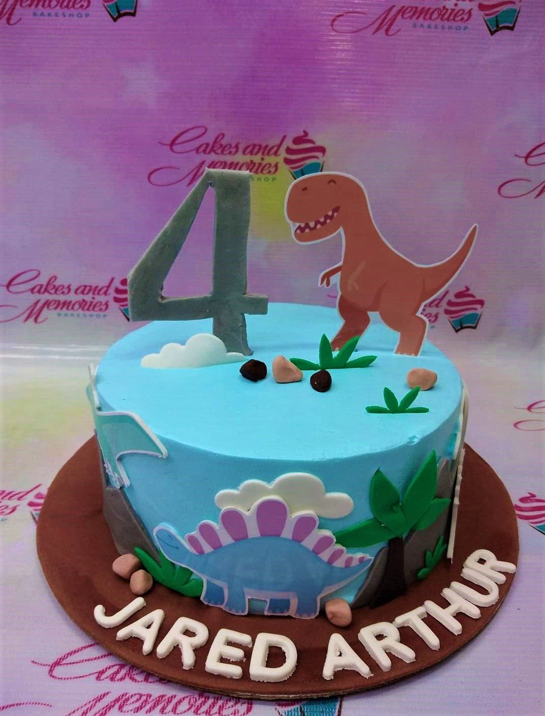 Light blue dinosaur themed birthday cake with a large number 4 topper and fondant dinosaur decorations on the side.