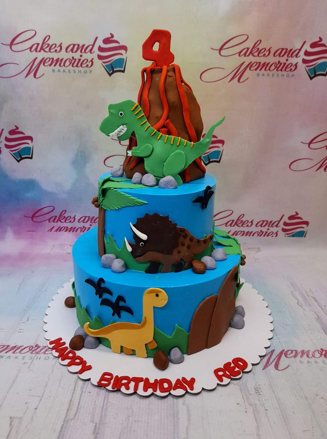 Two-tier blue dinosaur themed birthday cake with a fondant volcano, T-Rex, Triceratops, and Brontosaurus figures.