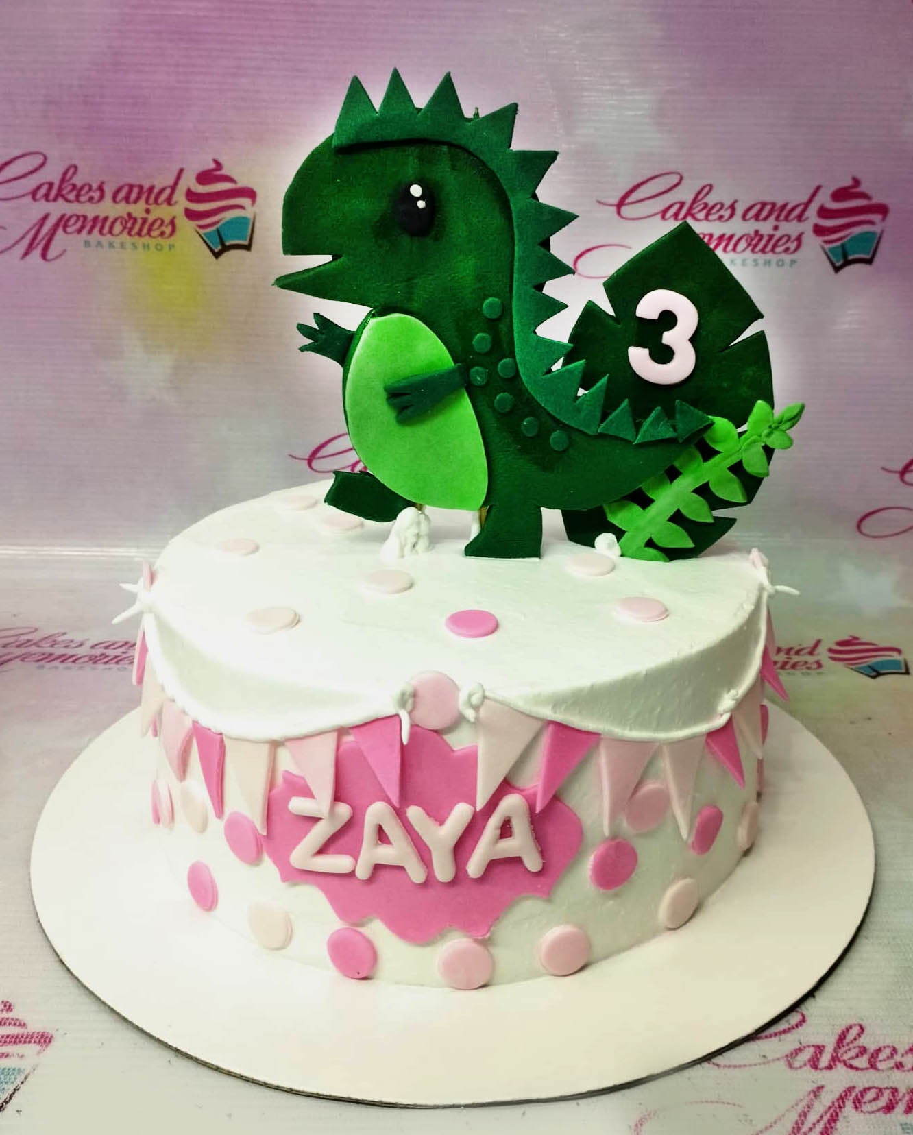 White 1-tier dinosaur birthday cake with pink and white polka dots, pink bunting, and a large green dinosaur topper for Zaya's 3rd birthday.