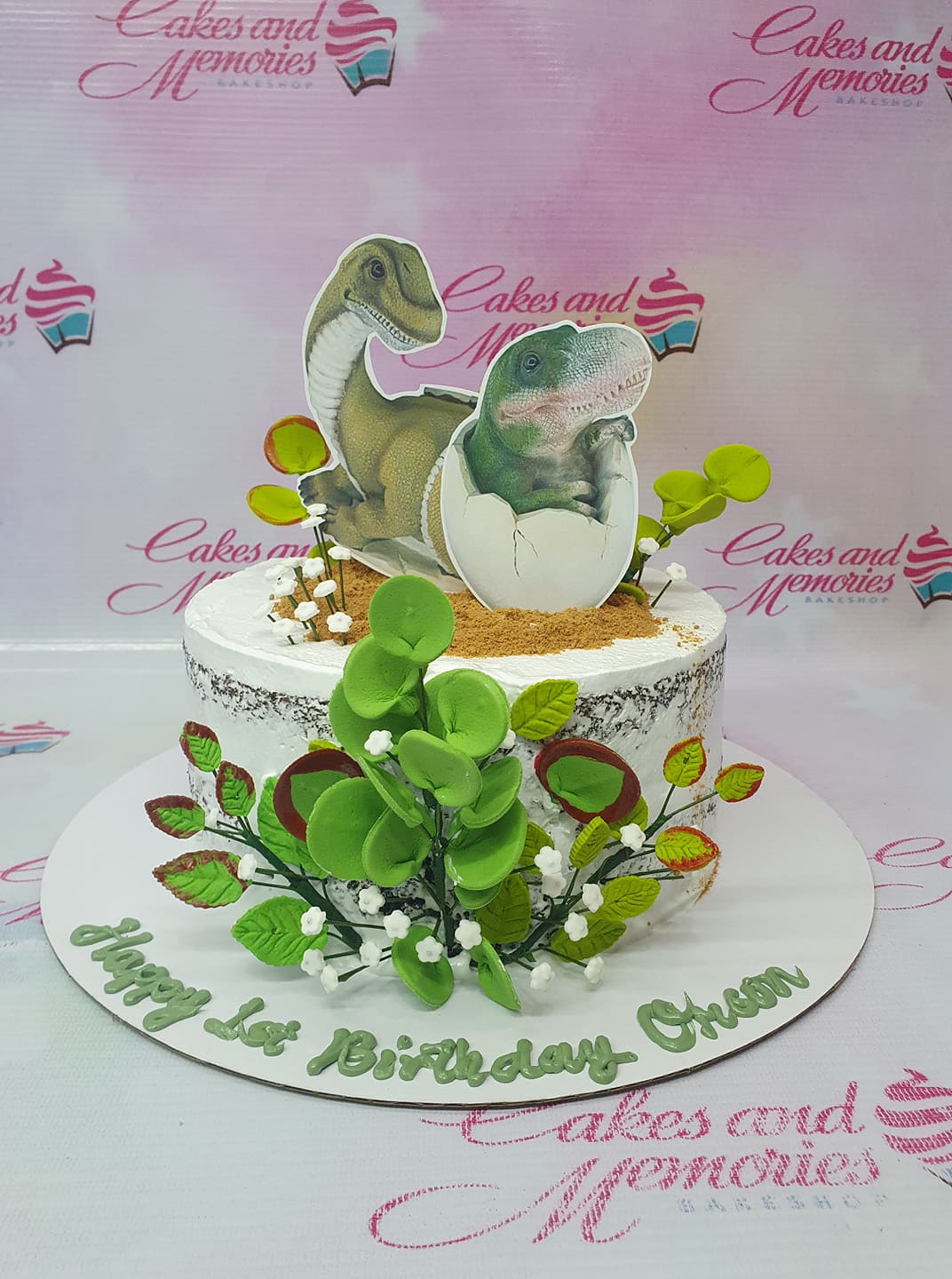 Dinosaur themed semi-naked birthday cake with T-Rex and hatching dinosaur printouts, green fondant leaves, and brown sugar sand.