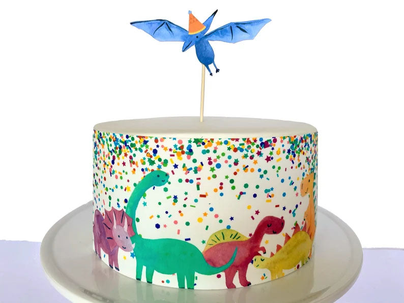 White fondant dinosaur birthday cake featuring colorful printed dinosaur cutouts and a blue pterodactyl topper with confetti patterns.