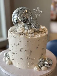 White textured buttercream cake decorated with various sized silver disco balls, silver stars, and white icing dollops.