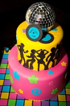 Two-tier disco themed fondant cake with a large silver disco ball topper, black dancer silhouettes, and colorful 70s retro accents.