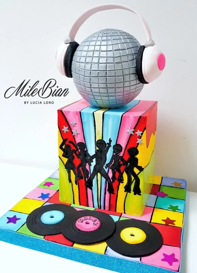 Retro disco themed square fondant cake with a large silver disco ball topper, headphones, and colorful dance floor base.