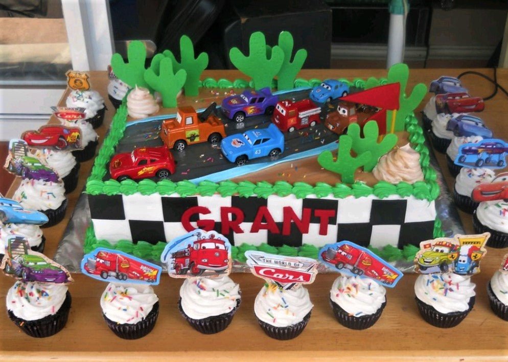 Disney Cars themed rectangle cake with toy cars, green cactus toppers, and a checkered flag side design for Grant's birthday.