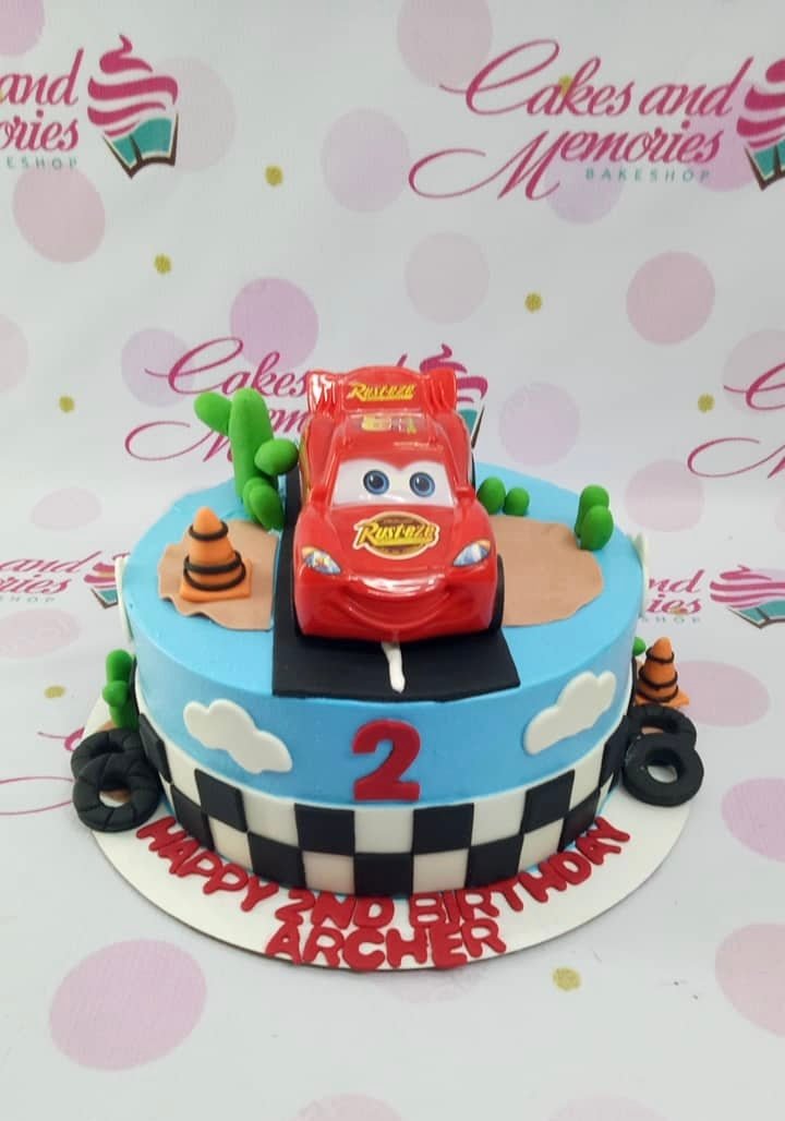 Disney Cars Lightning McQueen themed birthday cake with a red car topper, checkered flag border, and road design on blue icing.