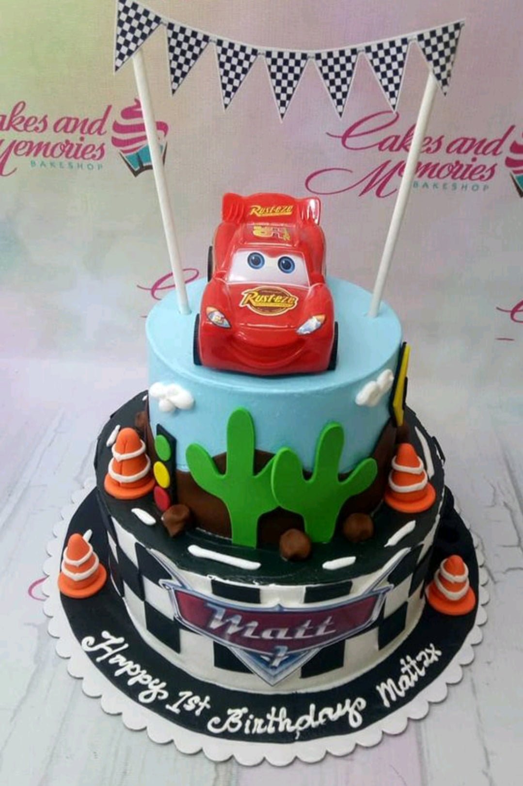 Two-tier Disney Cars themed birthday cake featuring Lightning McQueen, racing cones, and a checkered flag banner.