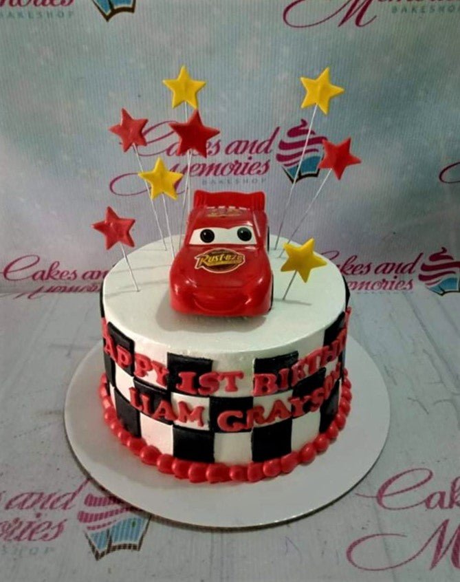 Disney Cars Lightning McQueen themed birthday cake with red and yellow stars and a black and white checkered pattern.
