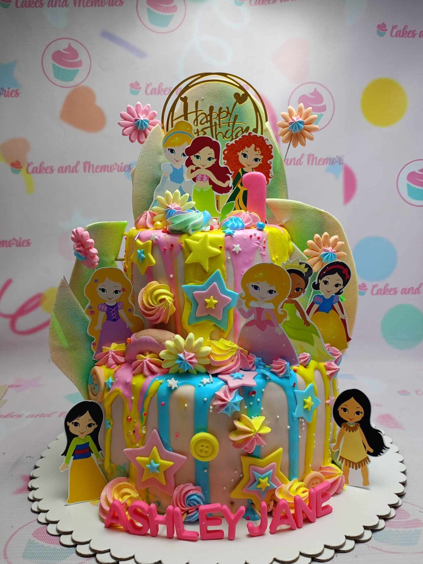 Colorful 2-tier Disney Princess themed birthday cake with pink and yellow icing drips, fondant stars, and character printouts.