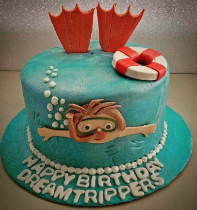 Teal underwater themed birthday cake featuring a 3D fondant diver, orange flippers, and a lifebuoy topper.