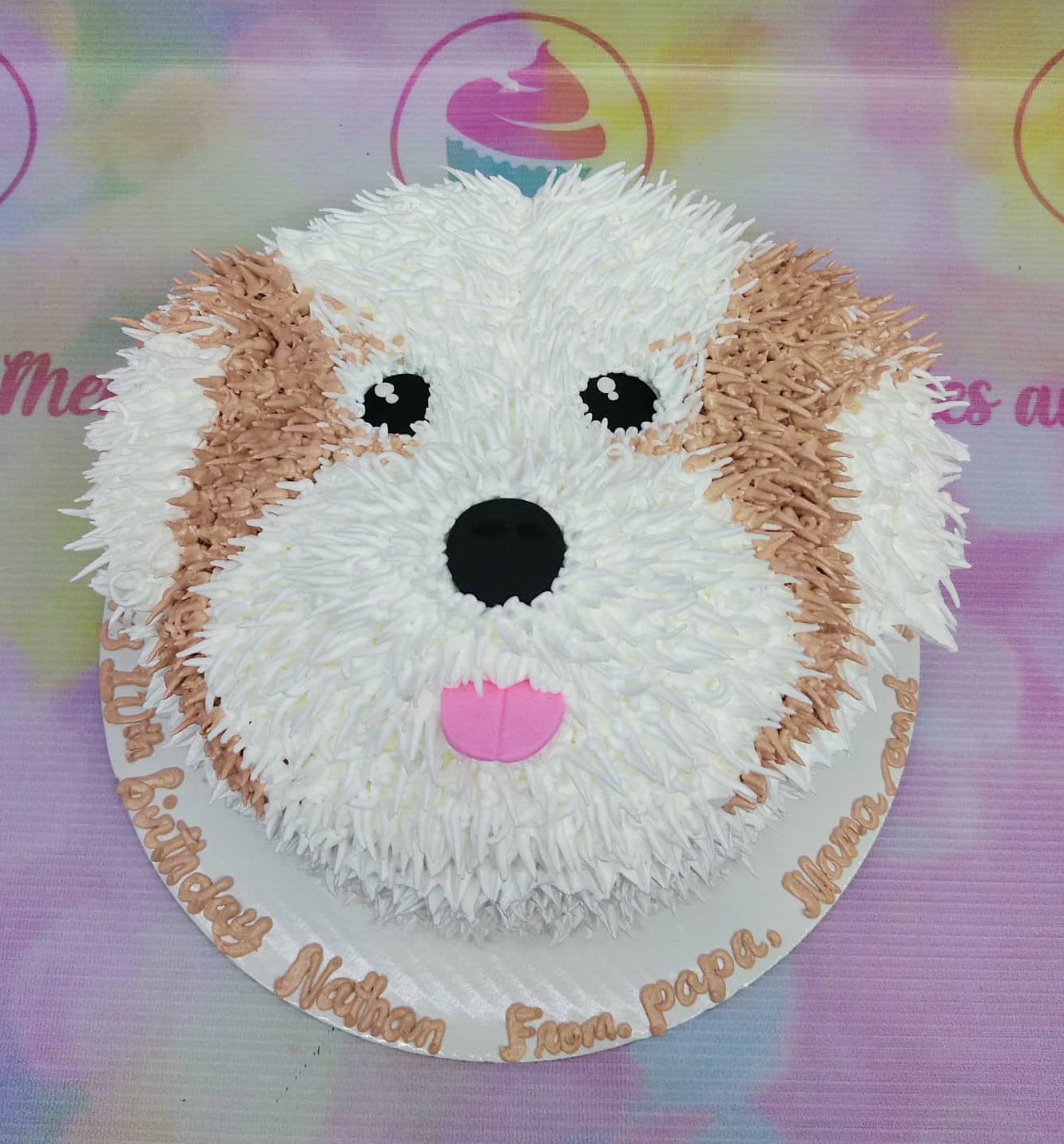 White and brown dog face cake with textured icing fur, black eyes, and a pink tongue on a white board.