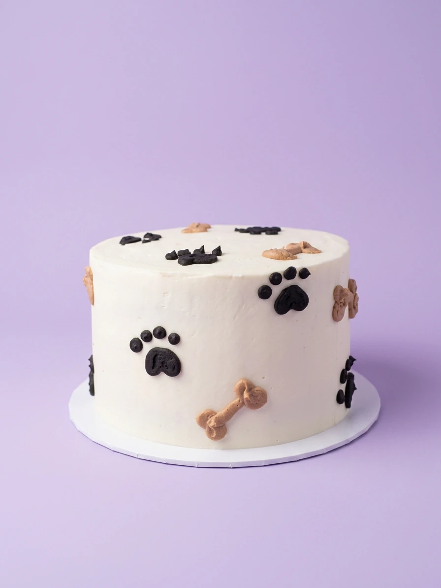 White single tier cake decorated with black paw prints and tan bone-shaped icing decorations.