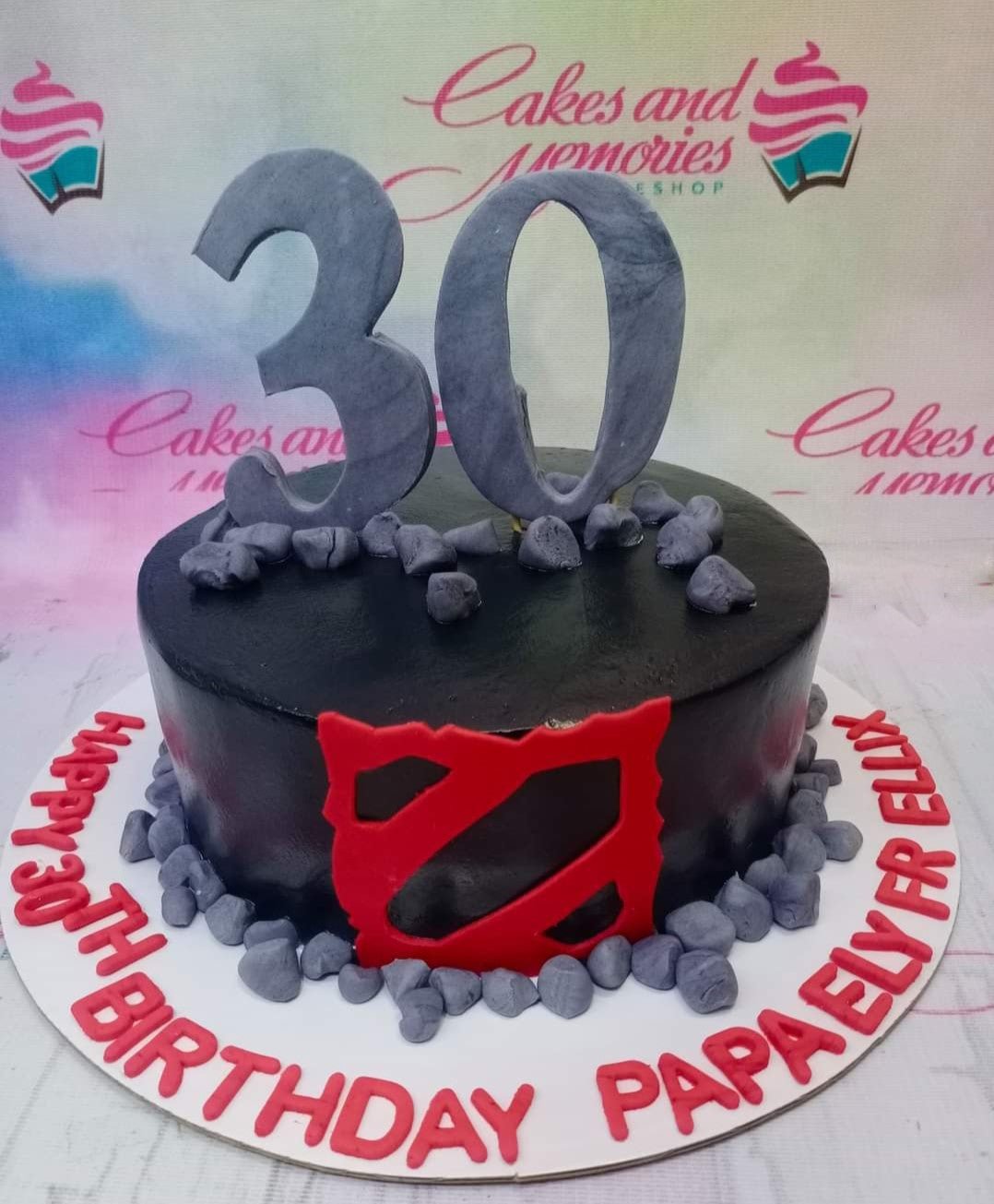 Black Dota 2 themed birthday cake with grey fondant rocks and large grey number 30 toppers.