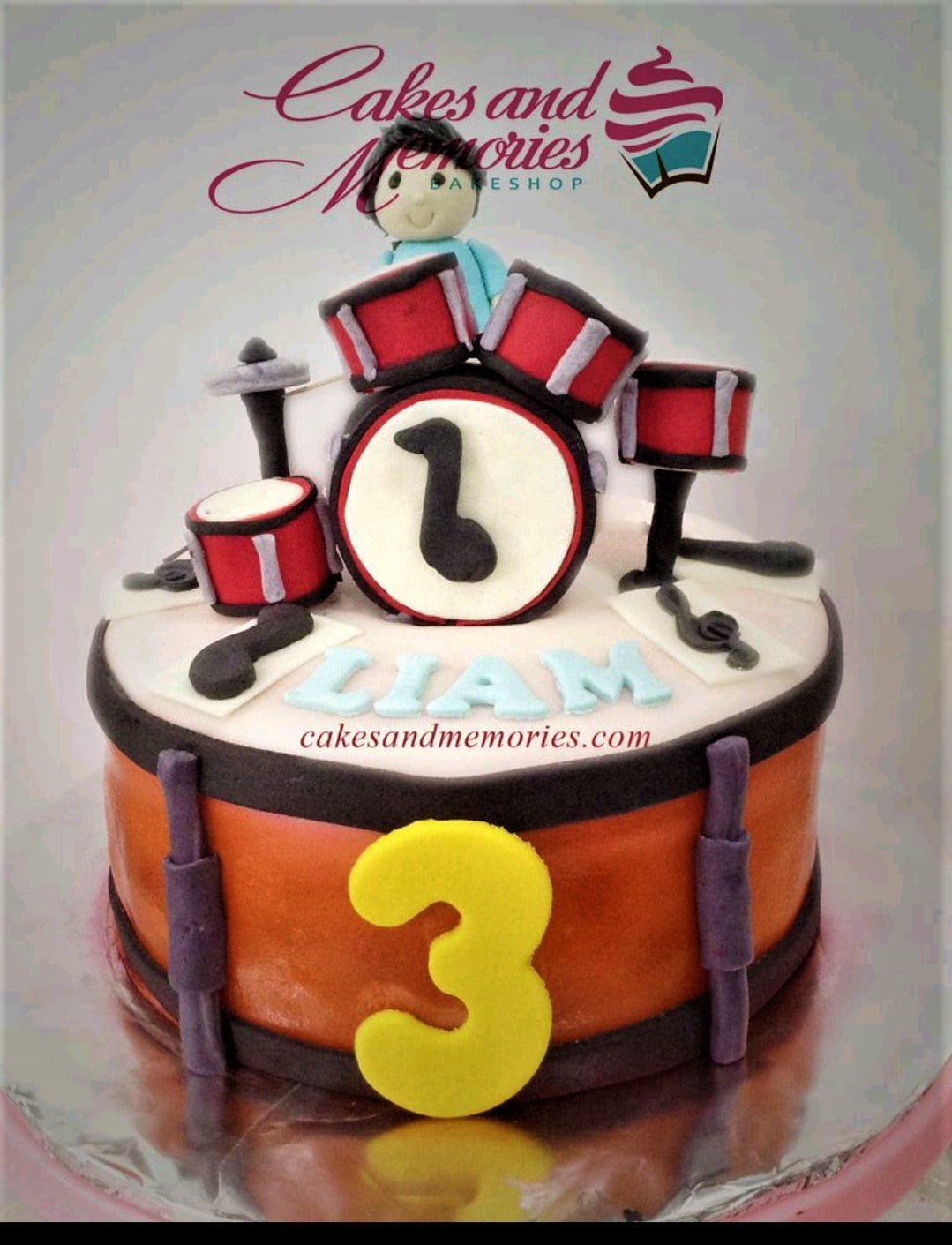 Drum set themed birthday cake with a fondant drummer figure, red drums, and musical notes for Liam's 3rd birthday.