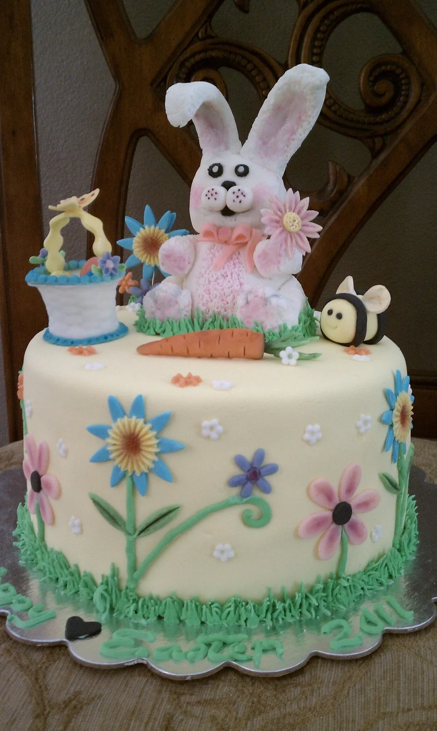 A yellow fondant Easter cake featuring a large 3D bunny topper, a carrot, a bee, and colorful gumpaste flowers with green grass piping.