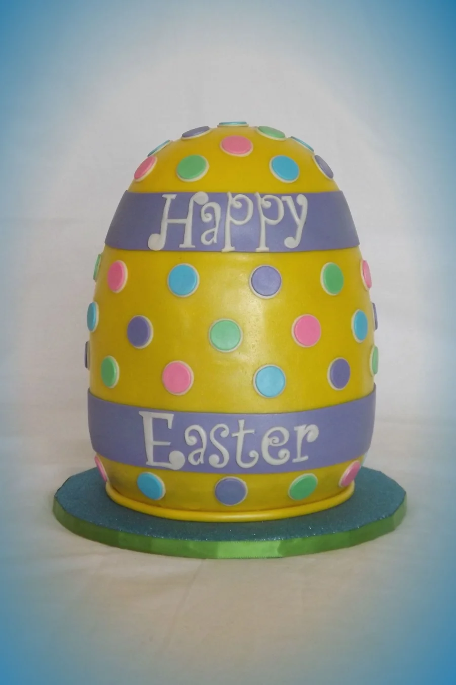 Yellow egg-shaped Easter cake with purple fondant bands and colorful polka dots on a green and blue base.