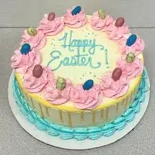 A round yellow and white Easter cake with pink icing rosettes, blue and brown candy eggs, and a blue 'Happy Easter!' message.