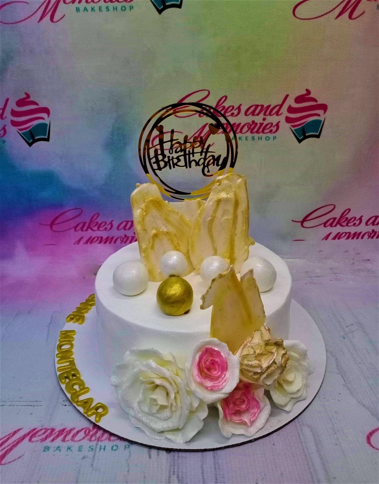 White soft-icing birthday cake with gold and pink edible flowers, white and gold spheres, and a gold Happy Birthday topper.