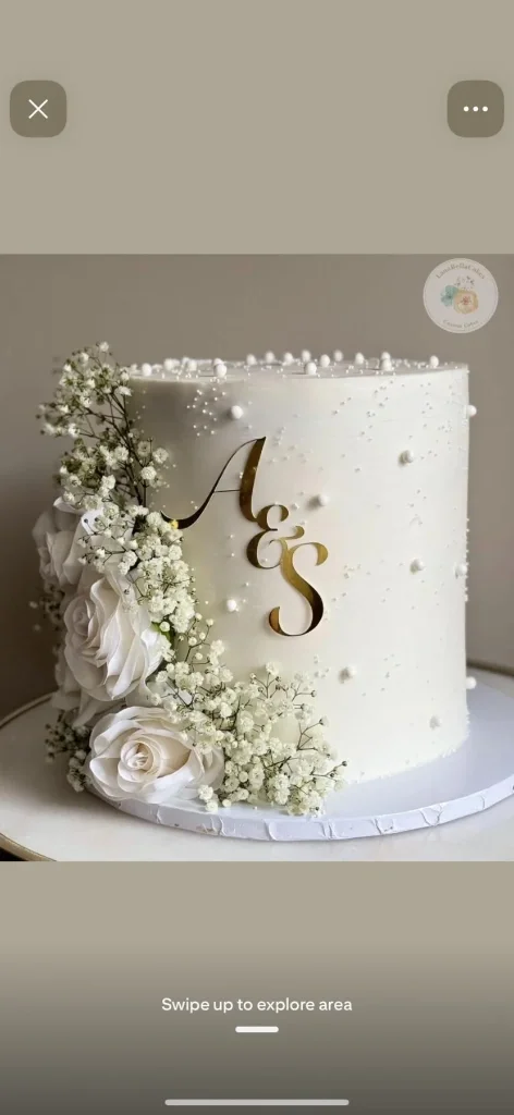 Elegant white tall cake decorated with white roses, baby's breath, and a gold acrylic 'A&S' monogram topper.