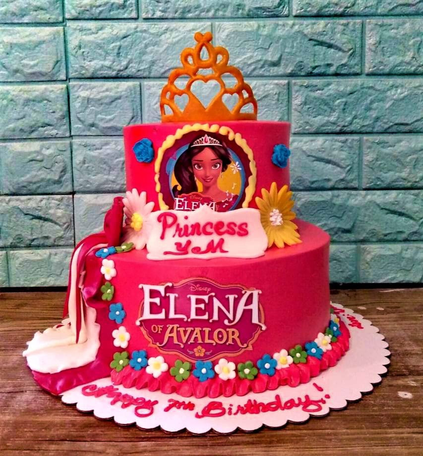 Two-tier hot pink Elena of Avalor themed birthday cake with a gold crown topper and floral icing decorations.