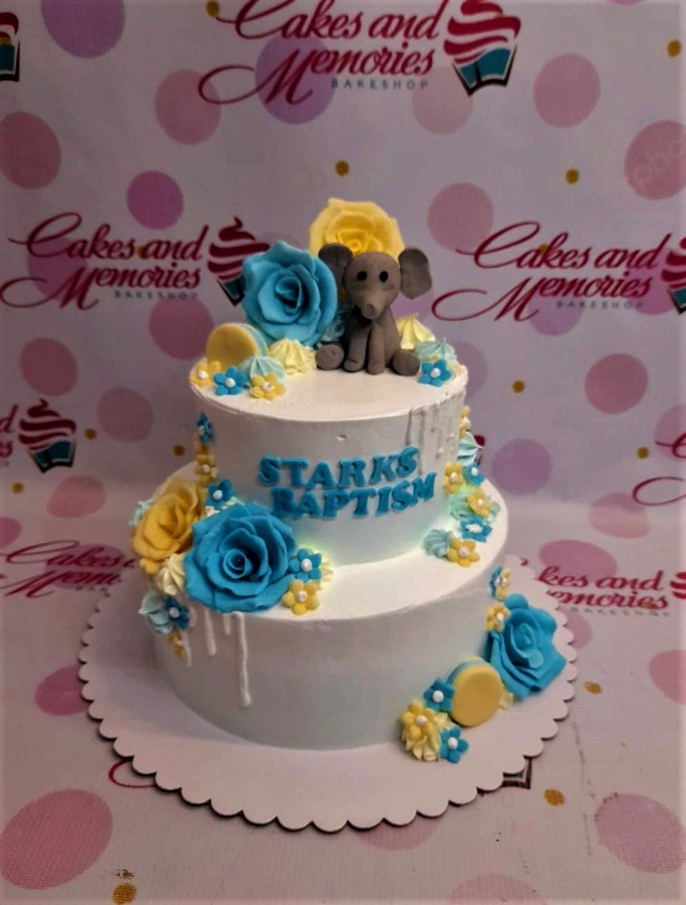 Two-tier white soft-icing baptism cake with blue and yellow fondant roses, an edible elephant topper, and blue icing text.