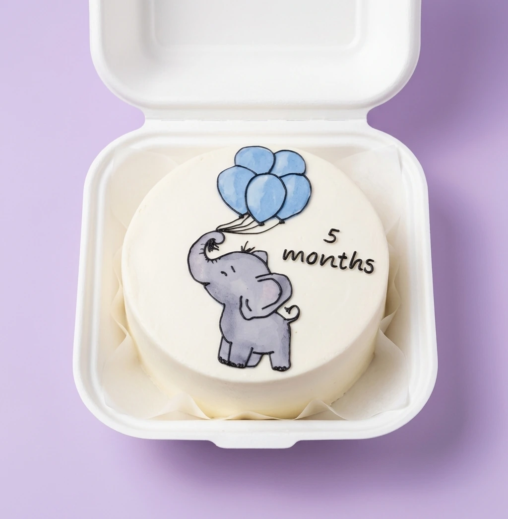 White minimalist bento cake featuring a hand-drawn style elephant holding blue balloons with '5 months' written in black icing.