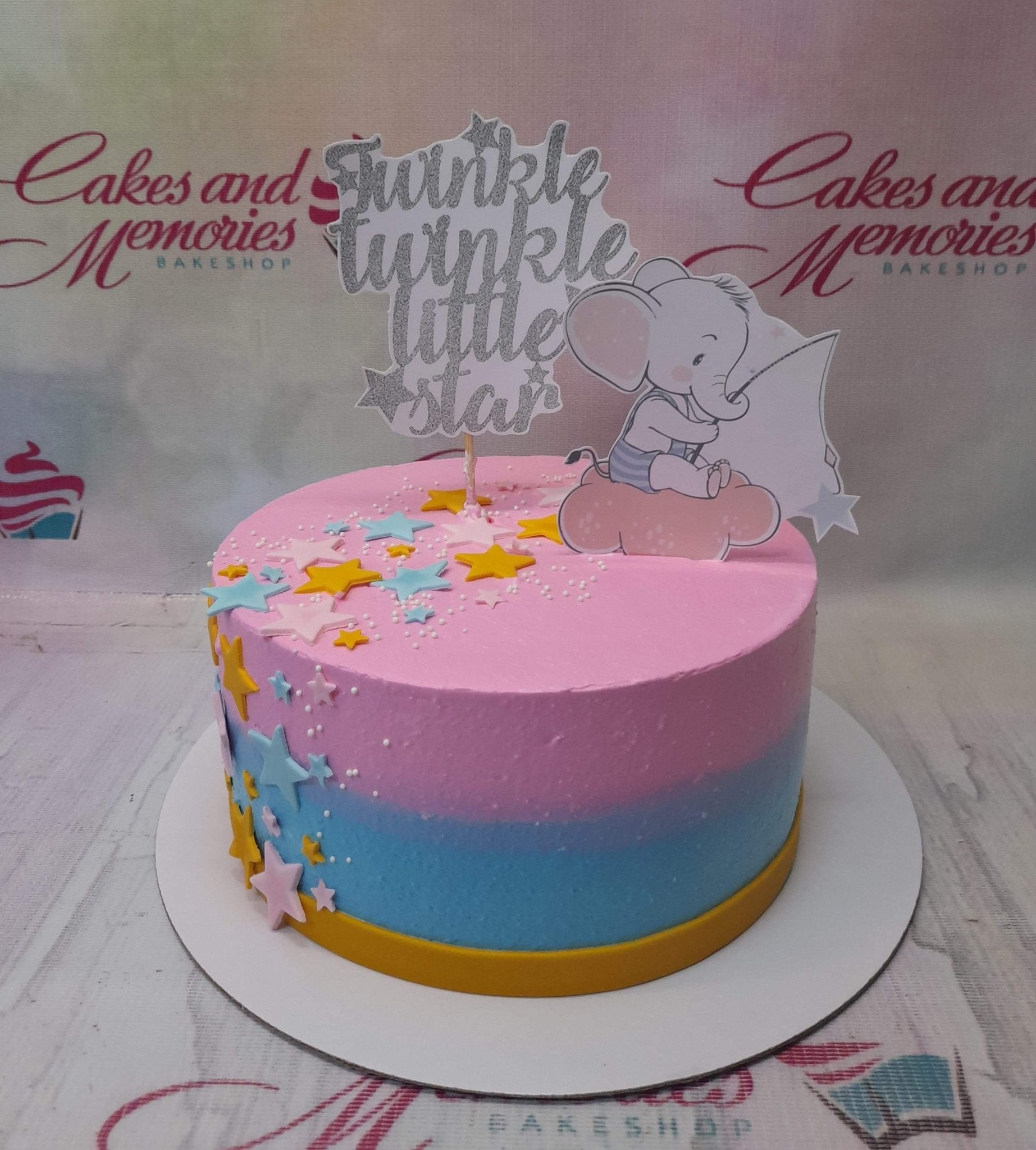Pink and blue gradient birthday cake with an elephant topper and silver glitter Twinkle Twinkle Little Star sign.