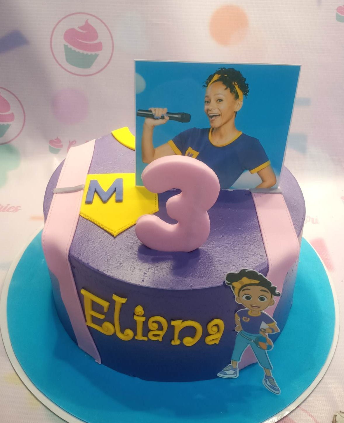 Purple 1-tier birthday cake with pink suspenders, a large pink number 3, and character printouts for Eliana.