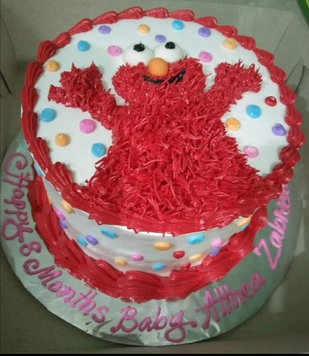 White round cake with a large red Elmo icing character on top, colorful dots, and red piped borders.