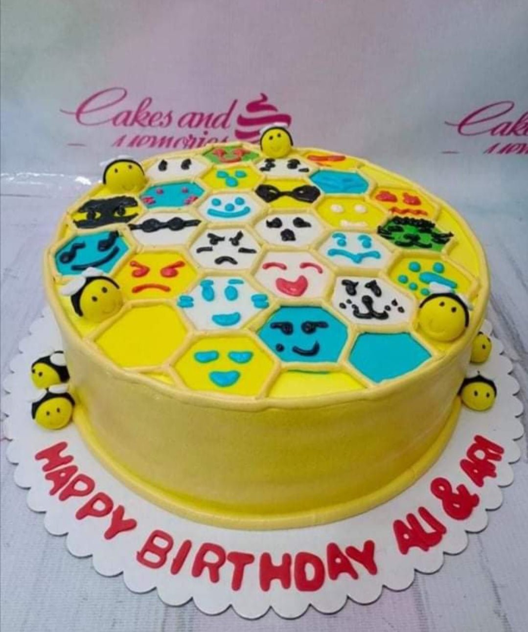 Yellow round cake with a honeycomb pattern on top featuring various emoji faces and small 3D fondant bees.