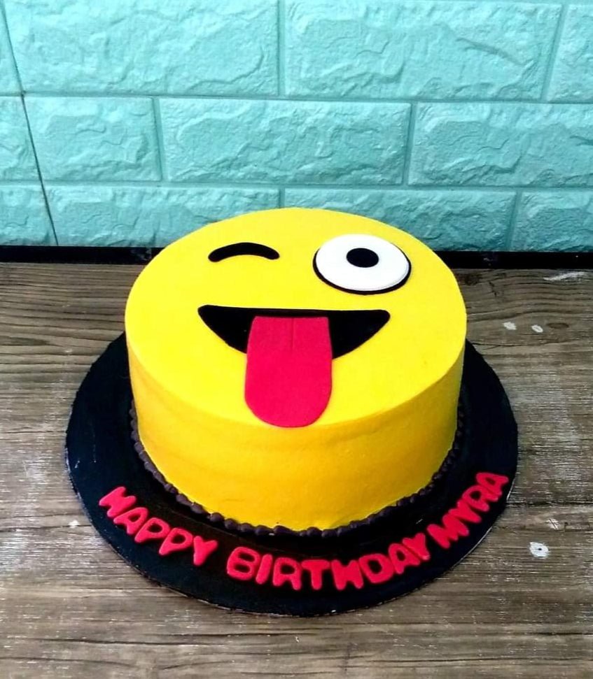 Yellow emoji birthday cake with a winking face and tongue out design, featuring pink icing text on a black base board.