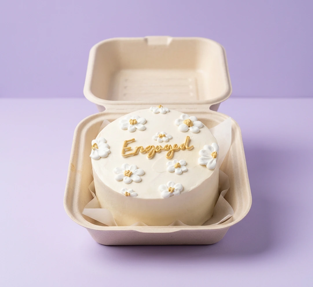 White bento cake with piped icing daisies and gold 'Engaged' message in a clamshell box.