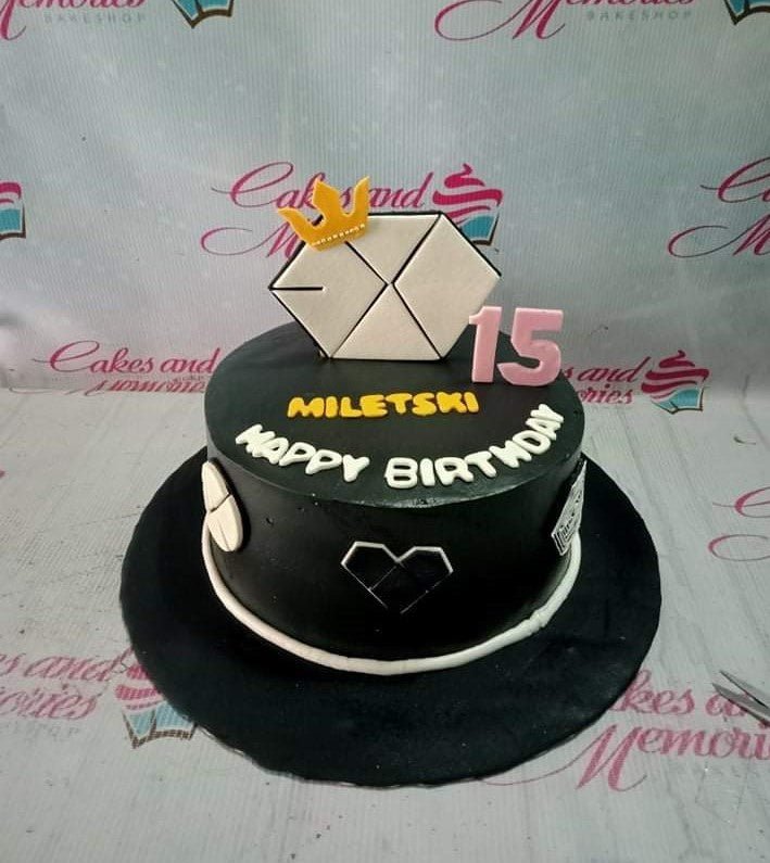 Black fondant cake with white EXO logo and crown topper for a 15th birthday celebration.