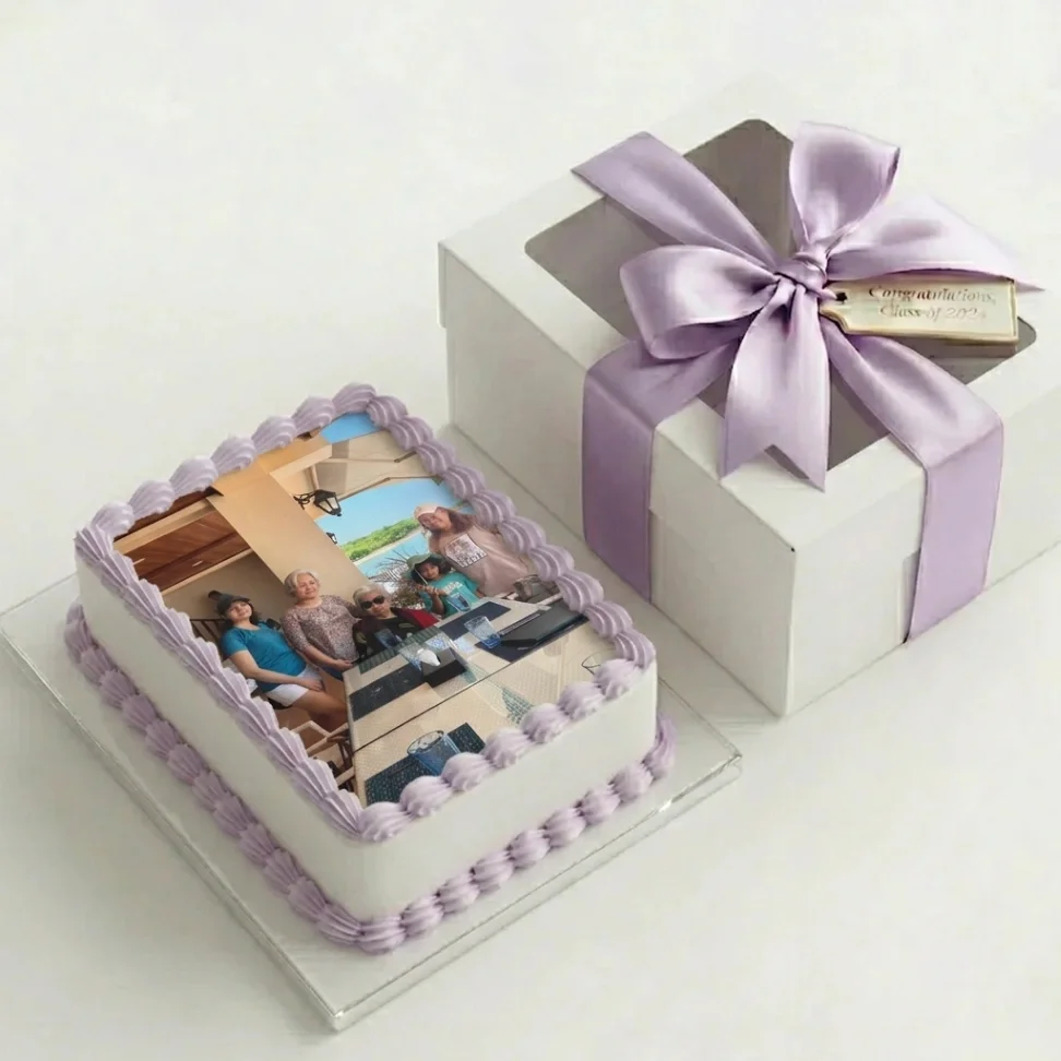 Square white cake with a large edible photo of a family on top, decorated with lavender icing rosettes and a matching purple ribbon on the box.