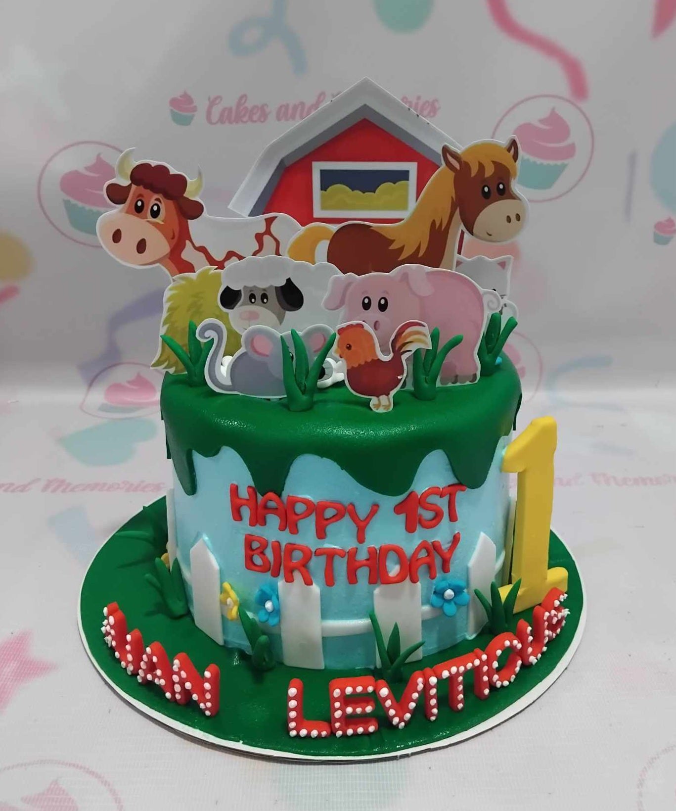 Light blue farm themed birthday cake with a red barn, cow, horse, pig, and sheep toppers, featuring a white picket fence and green grass.