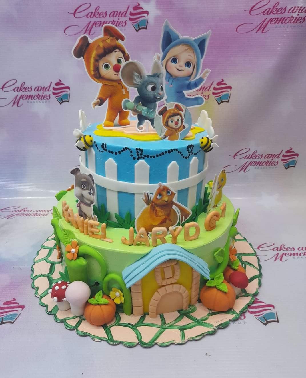 Two-tier farm and character themed cake with green and blue fondant, featuring printed animal characters, a fondant house, and pumpkins.
