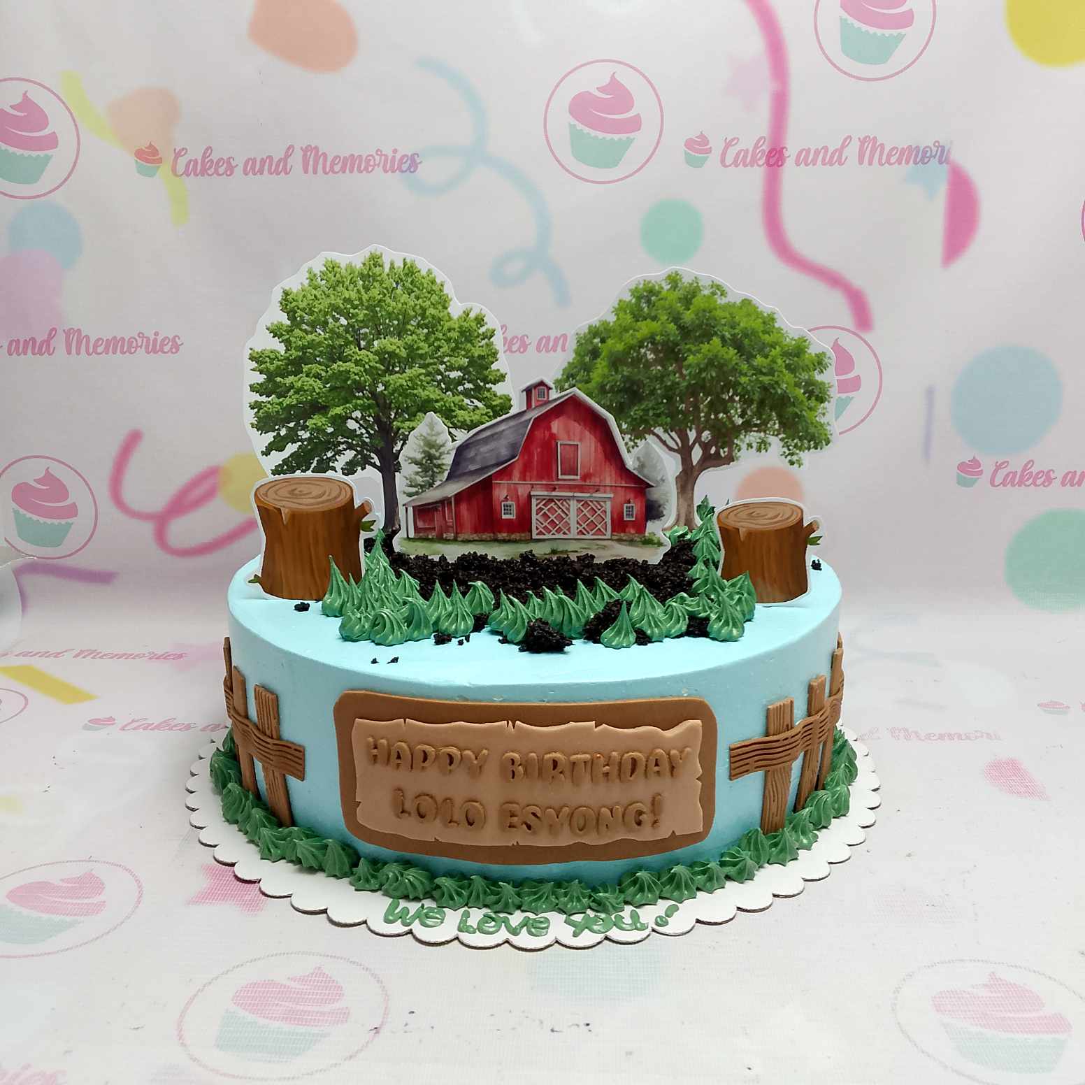 Light blue farm themed birthday cake for Lolo Esyong featuring a red barn, trees, and wooden fence decorations.