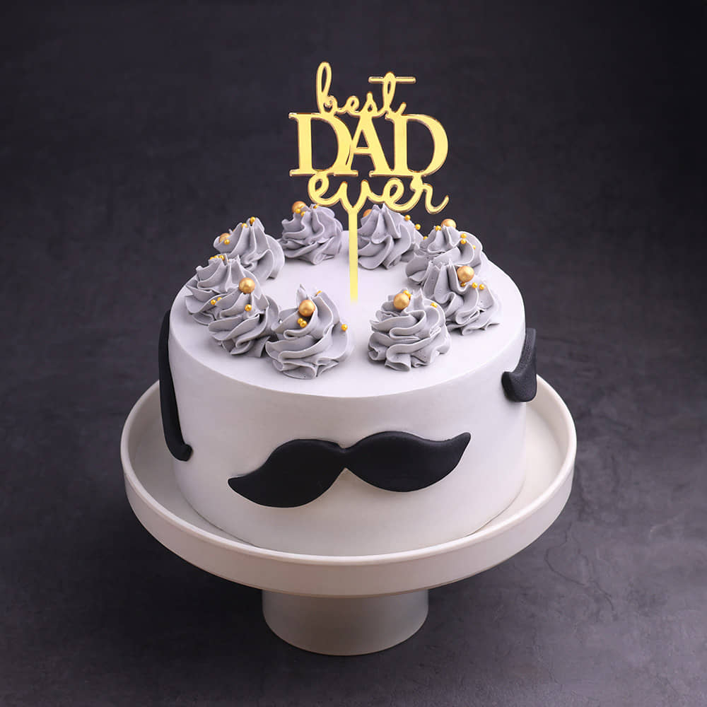 White minimalist cake for Father's Day featuring a gold Best Dad Ever topper, grey icing swirls with gold pearls, and black fondant mustaches.