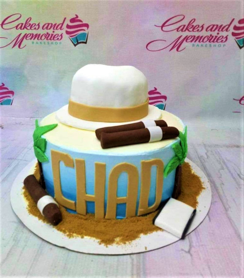 A blue and white fondant cake with a white fedora hat, cigars, and palm trees, featuring the name CHAD in gold letters.