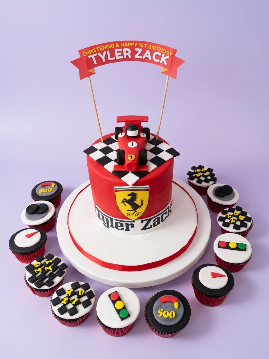 Red Ferrari themed birthday cake with a 3D race car topper, checkered flag pattern, and matching racing cupcakes.