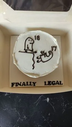 White bento cake with black minimalist doodle of a character pushing another off a cliff with numbers 18 and 17.