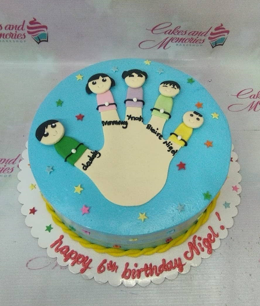 Light blue birthday cake with a large fondant hand and five finger family characters with faces and colorful outfits.