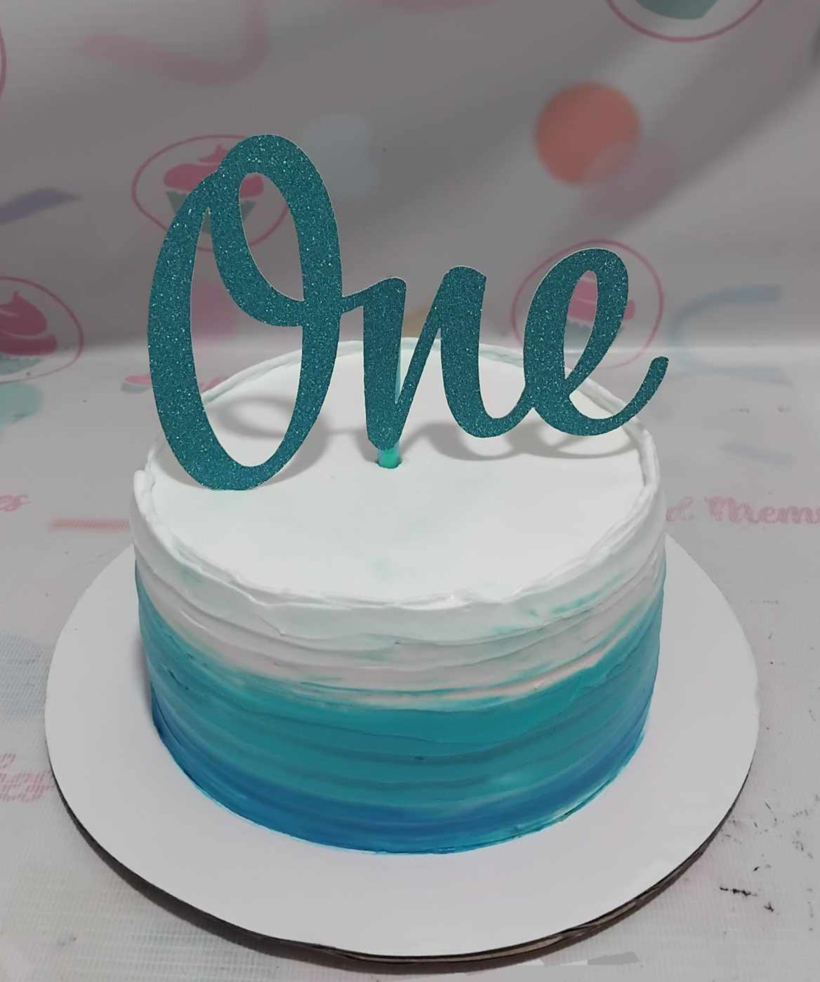 Single tier white and blue ombre cake with a large teal glittery 'One' topper.