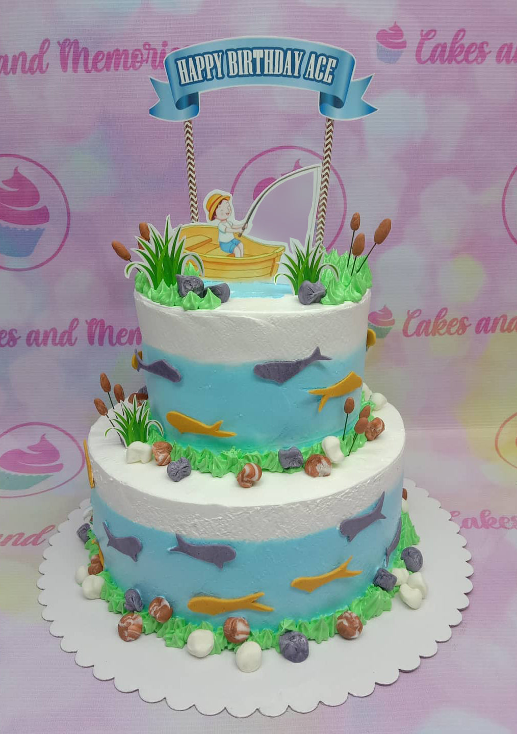 Two-tier fishing themed birthday cake with blue and white icing, fish decorations, and a fisherman in a boat topper.