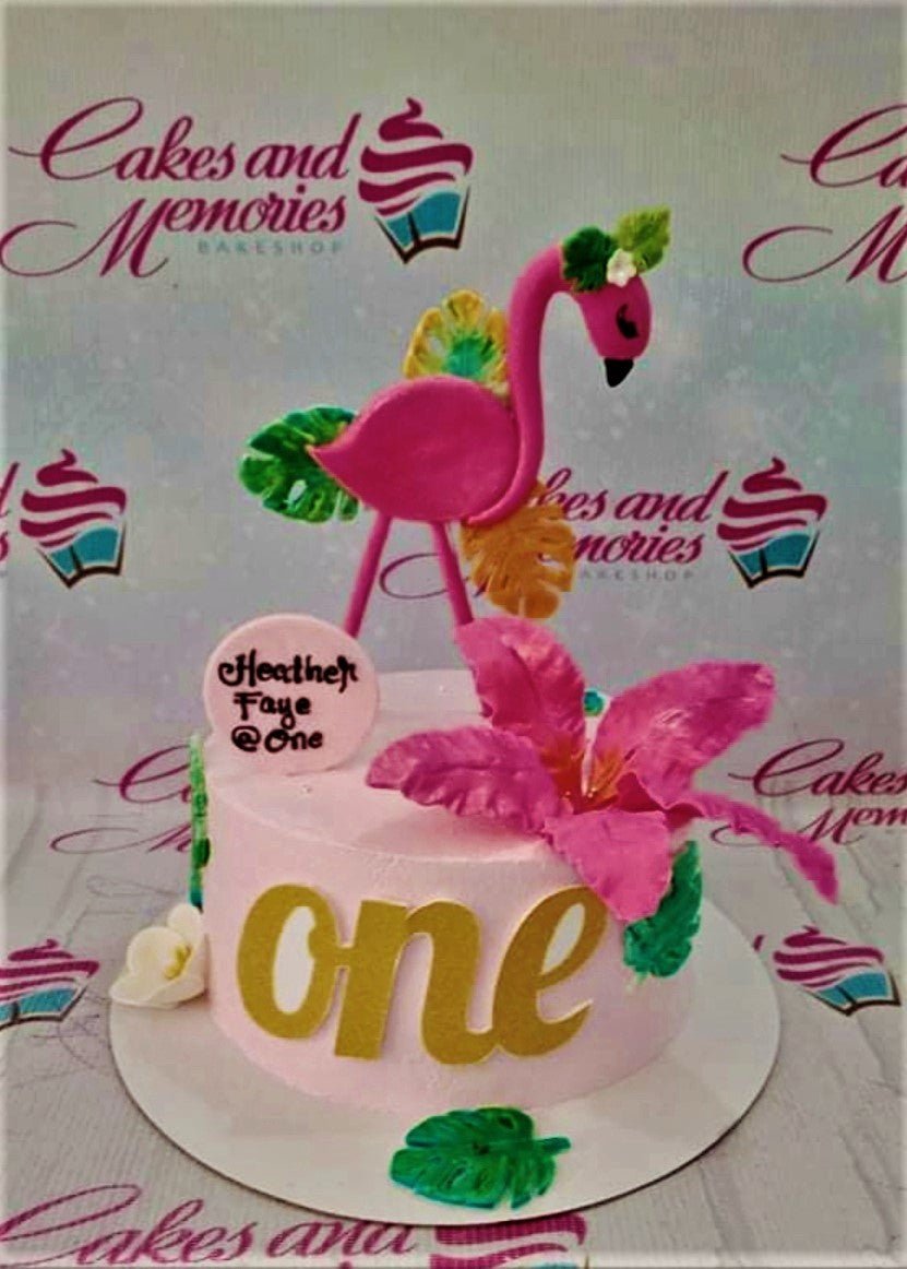 Pink flamingo birthday cake with a large pink flower, tropical leaves, and a gold 'one' topper for a first birthday celebration.