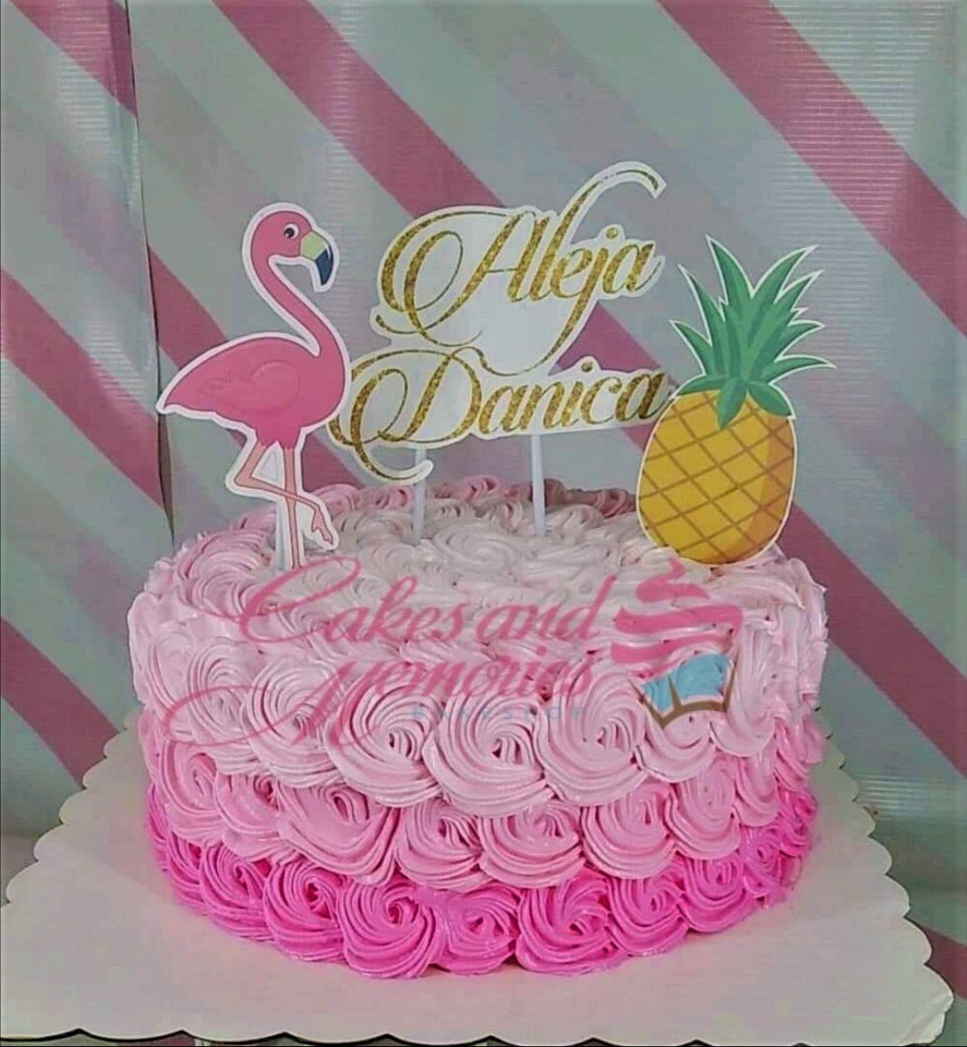 Pink ombre rosette cake with flamingo, pineapple, and gold glitter name toppers for Aleja Danica.