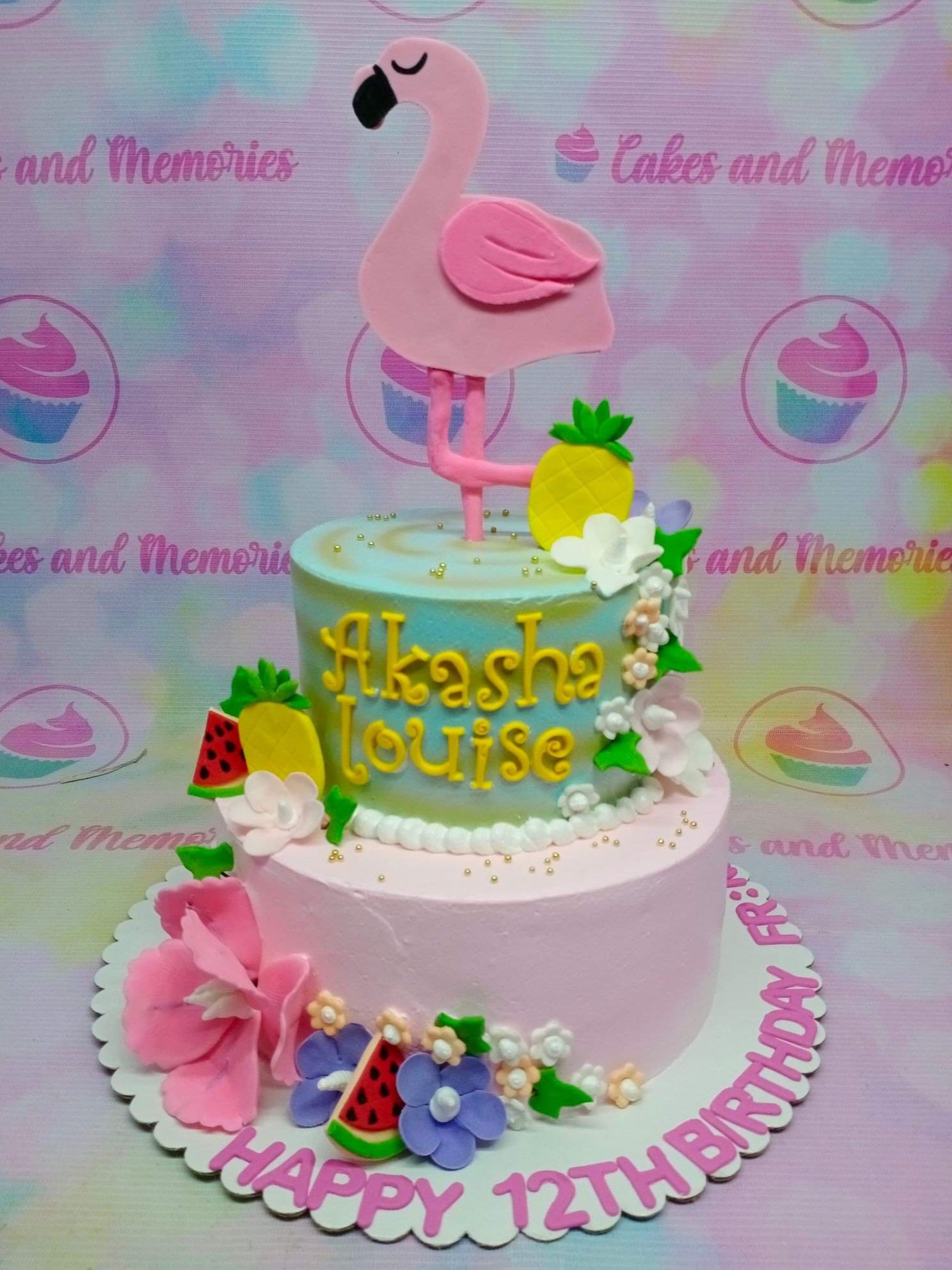 Two-tier tropical flamingo cake with pink and blue gradient icing, fondant flowers, pineapple, and watermelon accents.