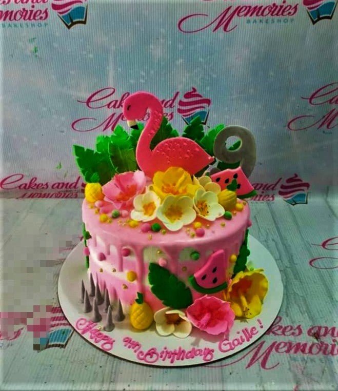 Pink flamingo tropical birthday cake with hibiscus flowers, watermelon slices, and a grey number 9 topper.