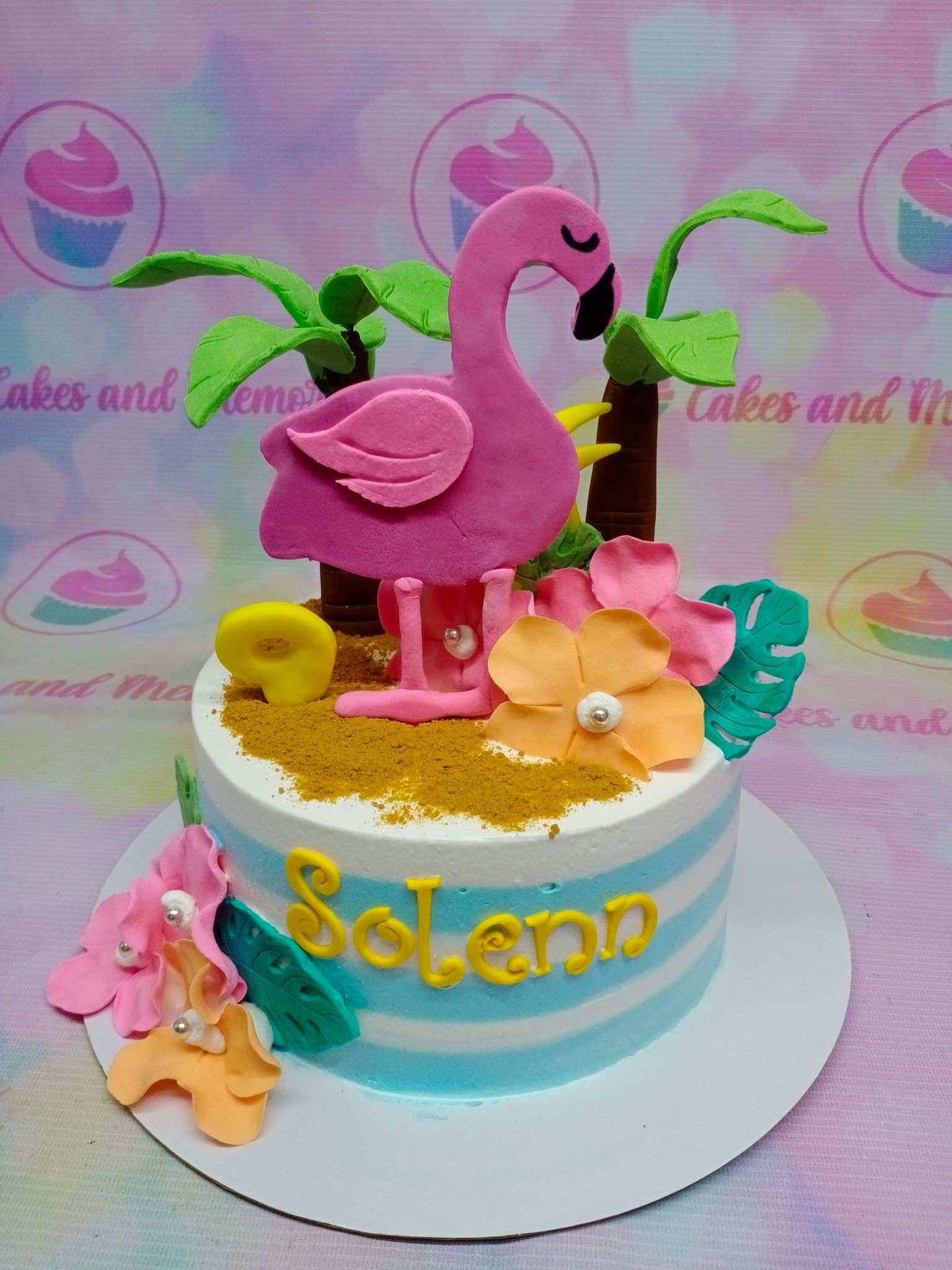 Tropical flamingo birthday cake with blue and white stripes, palm trees, hibiscus flowers, and a pink flamingo topper.