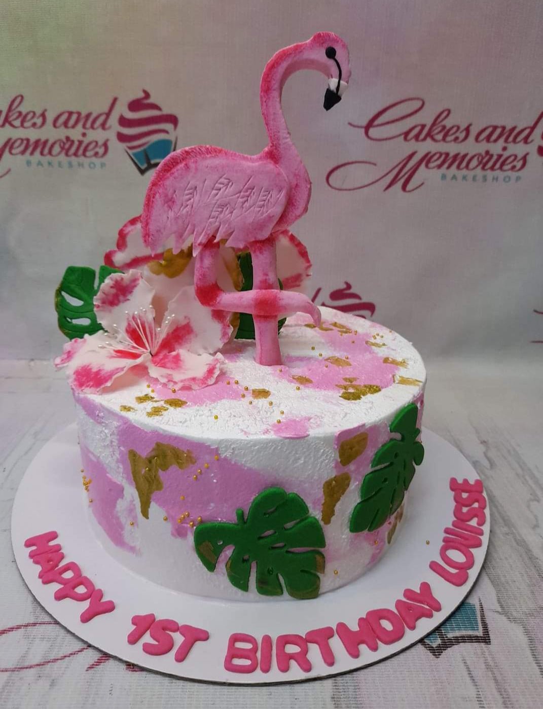 Pink and white flamingo birthday cake with tropical green leaves and gold accents